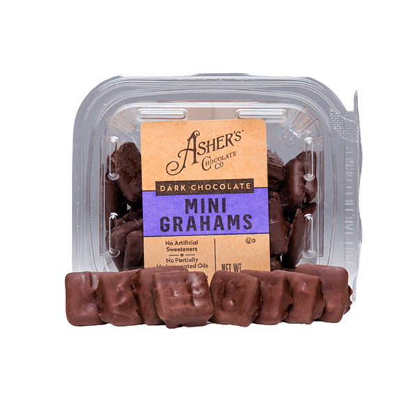 Introducing the 42092 - Asher Dark Mini Grahams, a delightful snack for any time of day. These bite-sized graham crackers are elegantly enrobed in rich, velvety dark chocolate, creating a perfect balance of sweetness and sophistication. Each pack contains 6 ounces of these delectable treats, conveniently divided into nine individually wrapped freshpacks to ensure freshness and portability. Whether you're looking for an indulgent snack for yourself or a premium treat to share with friends and family, Asher Dark Mini Grahams deliver exquisite taste and quality with every bite. Perfect for on-the-go snacking, lunchbox surprises, or as an upscale complement to your dessert table. Enjoy the luxurious taste of Asher Dark Mini Grahams today!