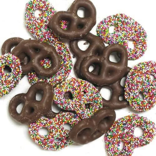 • Candy Type: Milk chocolate-covered mini pretzels with decorative nonpareils