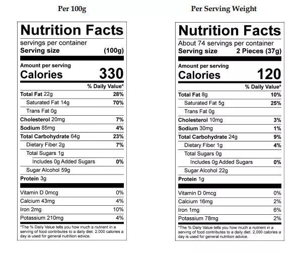 Allergen Information: Contains: Milk and Soy. Allergy Information: Shares Equipment with Products Containing Peanuts, Tree Nuts, Egg, and Wheat. Not a Reduced Calorie Food. Excess Consumption may have a laxative effect