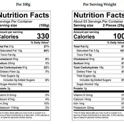 Maltitol, maltitol syrup, cocoa butter, chocolate liquor, cherries (preserved with potassium sorbate, sodium benzoate and sulfur dioxide), sorbitol, calcium caseinate (milk), milkfat, soya lecithin (an emulsifier), natural and artificial flavors, citric acid, red 40, blue 1, sucralose ( a non-nutritive sweetner). **Contains: Milk and Soy Ingredients. **Shares equipment with products containing: peanuts, tree nuts, milk, egg and wheat.