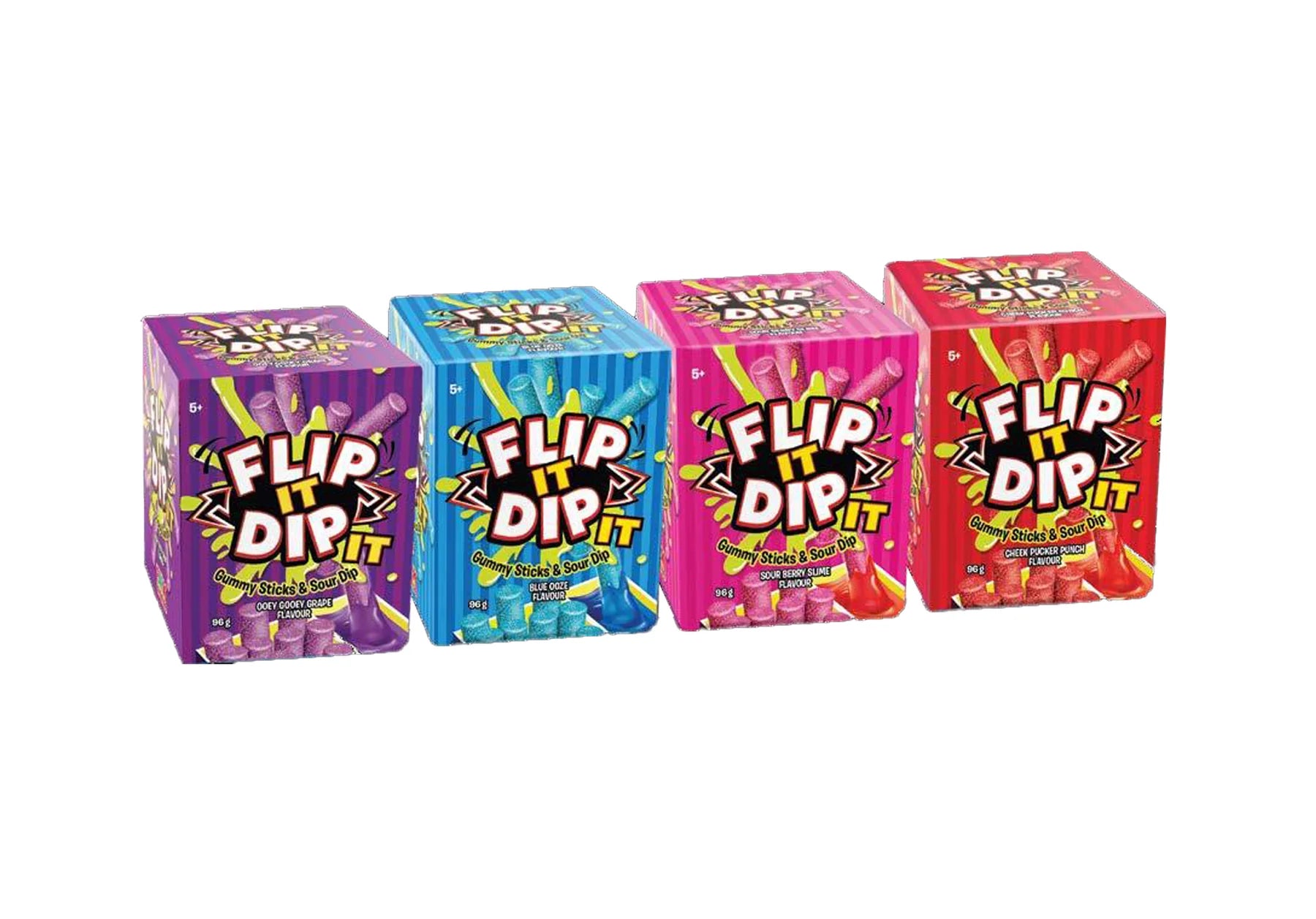 Introducing Flip and Dip Gummy Sticks & SOUR Dip from Foreign Candy Company! This fun-filled package is bursting with color and flavor. Each box contains 13 gummy sticks in 1 of 4 tantalizing flavors: Oooey Gooey Grape, Blue Ooze Blue Raspberry, Cheek Pucker Punch Fruit Punch, and Sour Berry Slime Strawberry. Each stick is paired with a matching sour gel for dipping, creating an interactive and delicious candy experience. Perfect for parties, snack time, or candy lovers craving a sweet and tangy adventure!