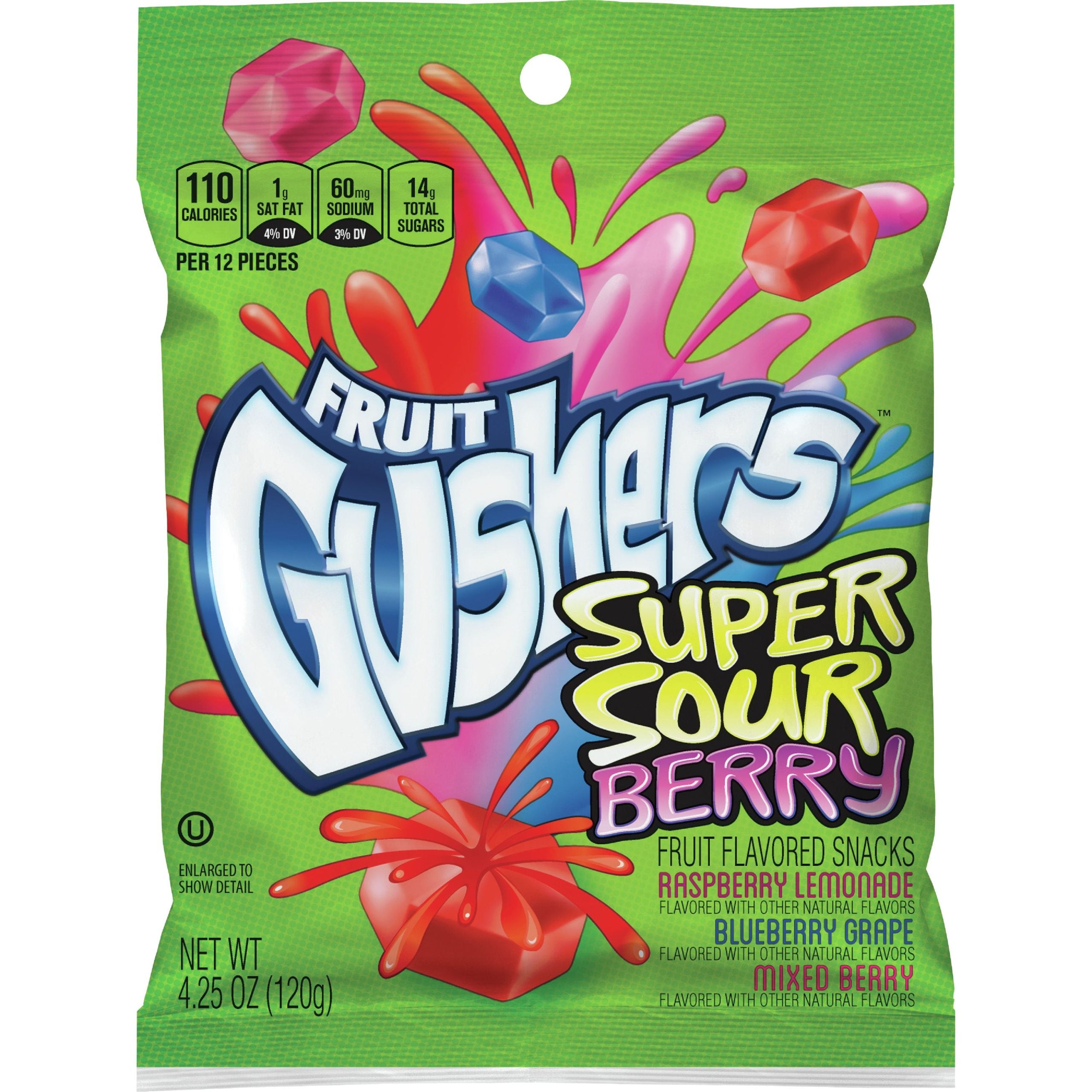 Experience a burst of intense sour flavor with Gushers Super Sour Berry! Each 4.25 oz pack contains chewy candy shells filled with a mouth-puckering, berry-flavored liquid center that delivers a bold, tangy surprise in every bite.