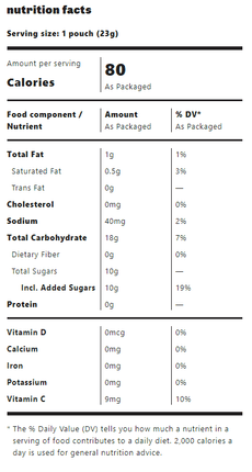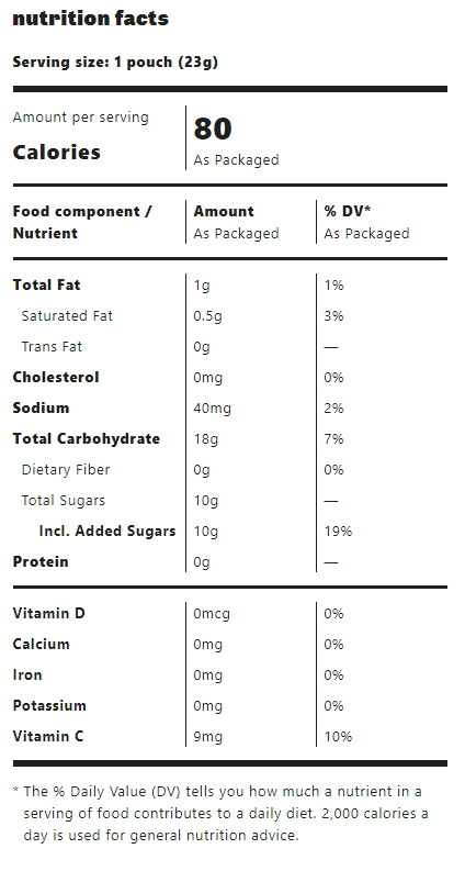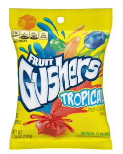 Sugar, Corn Syrup, Dried Corn Syrup, Pear Puree Concentrate, Modified Corn Starch, Fructose, Maltodextrin, Palm Oil. Contains 2% of less of: Cottonseed Oil, Glycerin, Grape Juice Concentrate, Carrageenan, Citric Acid, Monoglycerides, Sodium Citrate, Malic Acid, Vitamin C (ascorbic acid), Natural Flavor, Potassium Citrate, Agar-Agar, Xanthan Gum, Color (red 40, blue 1, yellow 5 & 6).