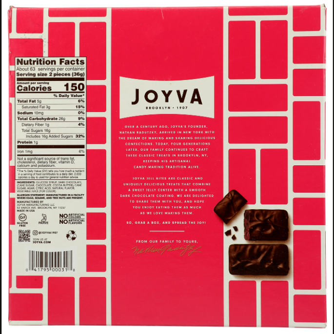 This bulk 5 lb package is perfect for candy buffets, gift baskets, retail displays, events, and repackaging. A great option for customers who love traditional raspberry jelly candies with a decadent chocolate twist. Joyvaโs treats are Kosher Parve, making them suitable for a wide range of shoppers.