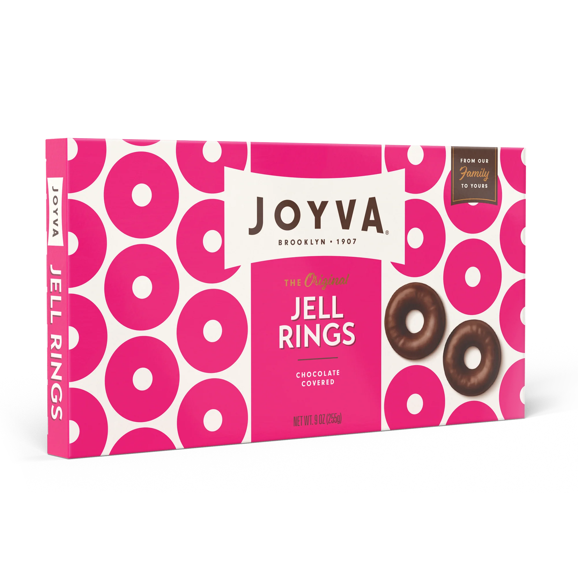 Box contains 5 pounds of Joyva Dark Chocolate Covered Raspberry Jell Rings Candy. Made in the USA.