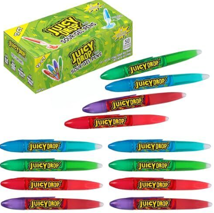 The Bazooka Company Juicy Drop Gel Pens 24ct offer a fun, interactive twist on candy that kids absolutely love! Each case includes 24 individually packaged Juicy Drop Gel Pens, combining a delicious sweet-and-tangy gel candy with a playful pen-style dispenser. Kids can “draw” their own flavor intensity by squeezing the gel onto lollipops, gummies, or directly onto the built-in candy surface for a customized, flavorful experience.